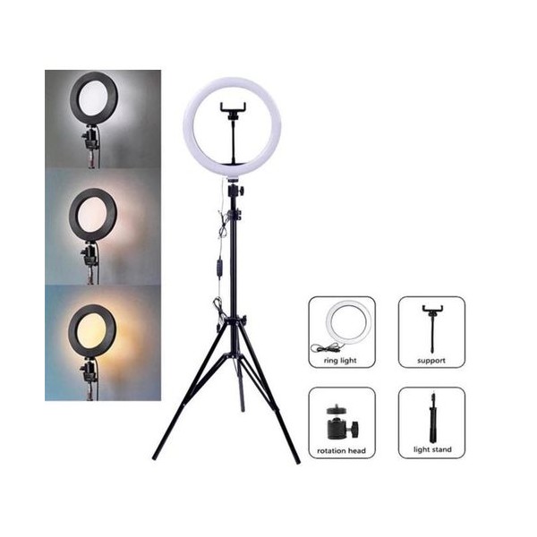 Ring Light pro 26 cm Diamètre Bague lumineux + Trépied 2,1 mètre est un outils professionnel parfait pour réussir vos photo , diffusion en direct YouTube, Instagram blogueurs ,Photographie, Maquillage, Salons de Beauté, spectacle en direct, selfie, chat vidéo, aider à améliorer la qualité du selfie, chat vidéo. Mode d’éclairage 3 couleurs: blanc, jaune chaud et blanc chaud Compatible avec la plupart des téléphones intelligents avec ou sans étui.